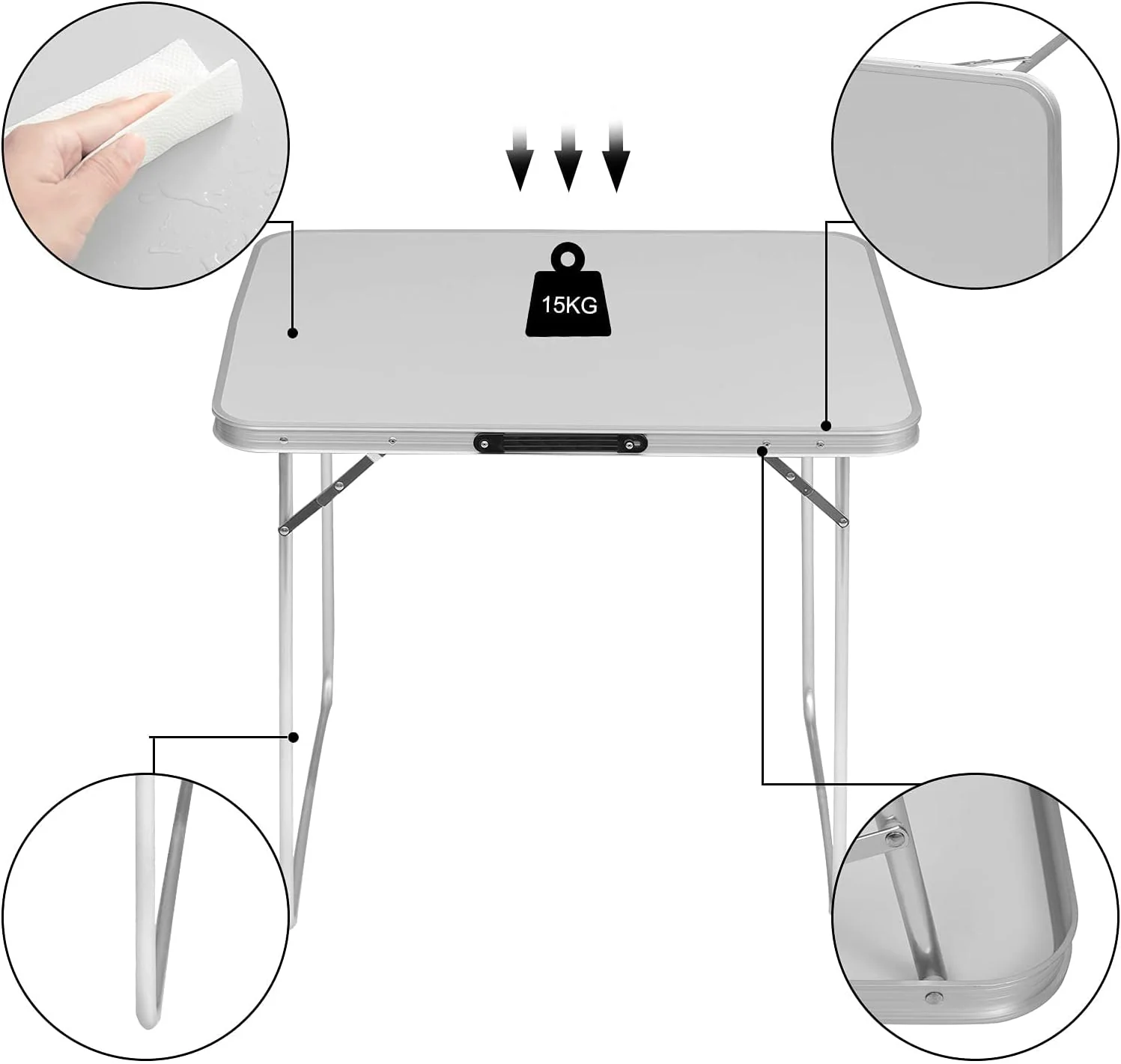 - Material: la superficie de la mesa está hecha de MDF (fibra de densidad media), que es resistente a los arañazos, a la oxidación y fácil de limpiar. La construcción de aluminio ligero hace que la mesa plegable sea fácil de transportar. Los marcos de tubos de acero ofrecen más estabilidad.
