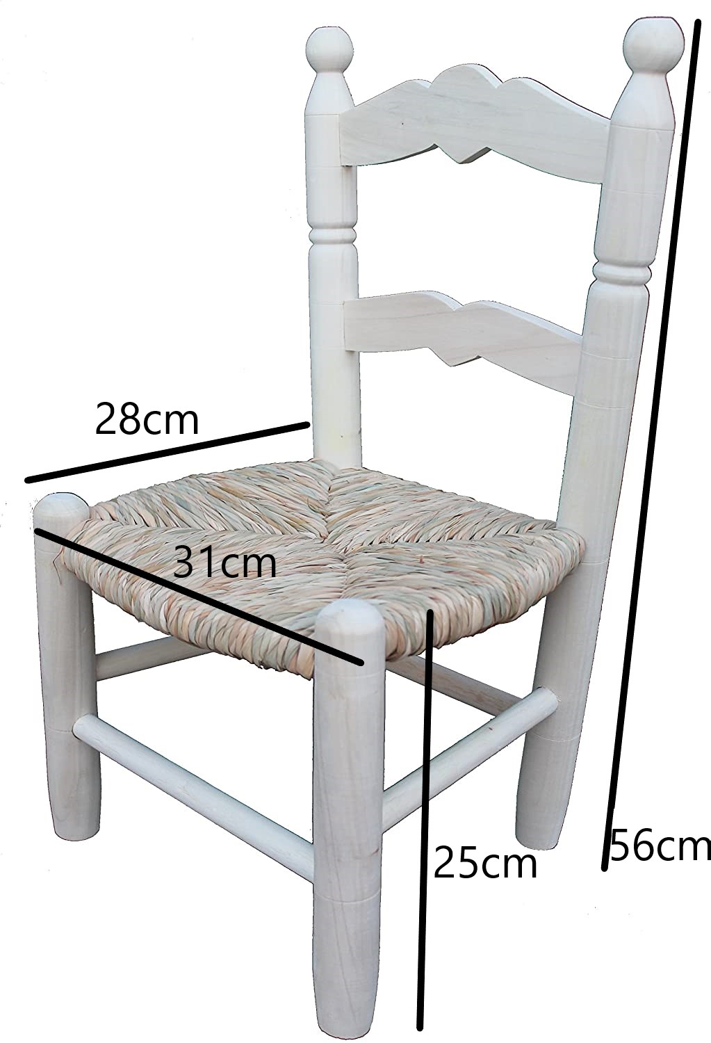 Silla infantil en madera de chopo con asiento hecho a mano de forma artesanal con anea natural. Madera al natural. Medidas: Profundidad: 28cm Ancho: 32cm Altura: 56 cm Altura del asiento: 26 cm