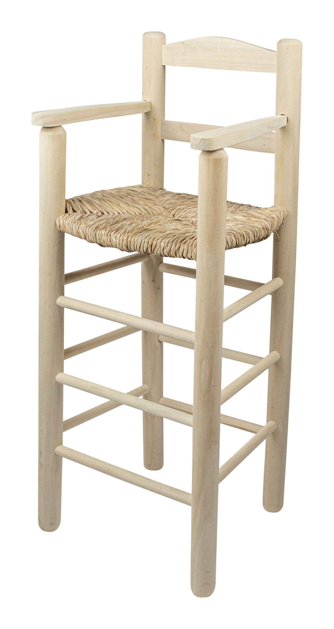 Sillón Trona Infantil en madera de chopo con asiento hecho a mano de forma artesanal con anea natural. Torneado Circular. Madera al Natural para posterior pintado.