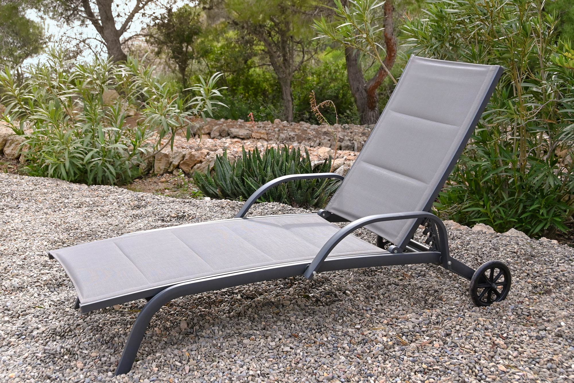 - DESCRIPCIÓN: TUMBONA ALUMINIO TEXTILENE 193X70X30 RUEDAS GRIS